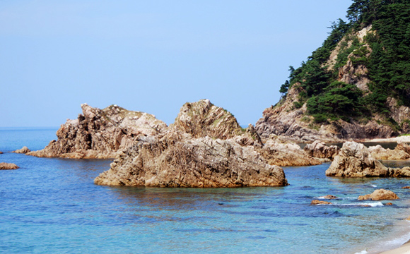 新潟県最北端に位置する「笹川流れ」は約11km続く海岸で景勝地として知られています。透明度の高い青い海、白い砂浜、日本海の荒波が作り出す独特な岩礁が美しい情景を作りだし、国の天然記念物の指定地域となっています。